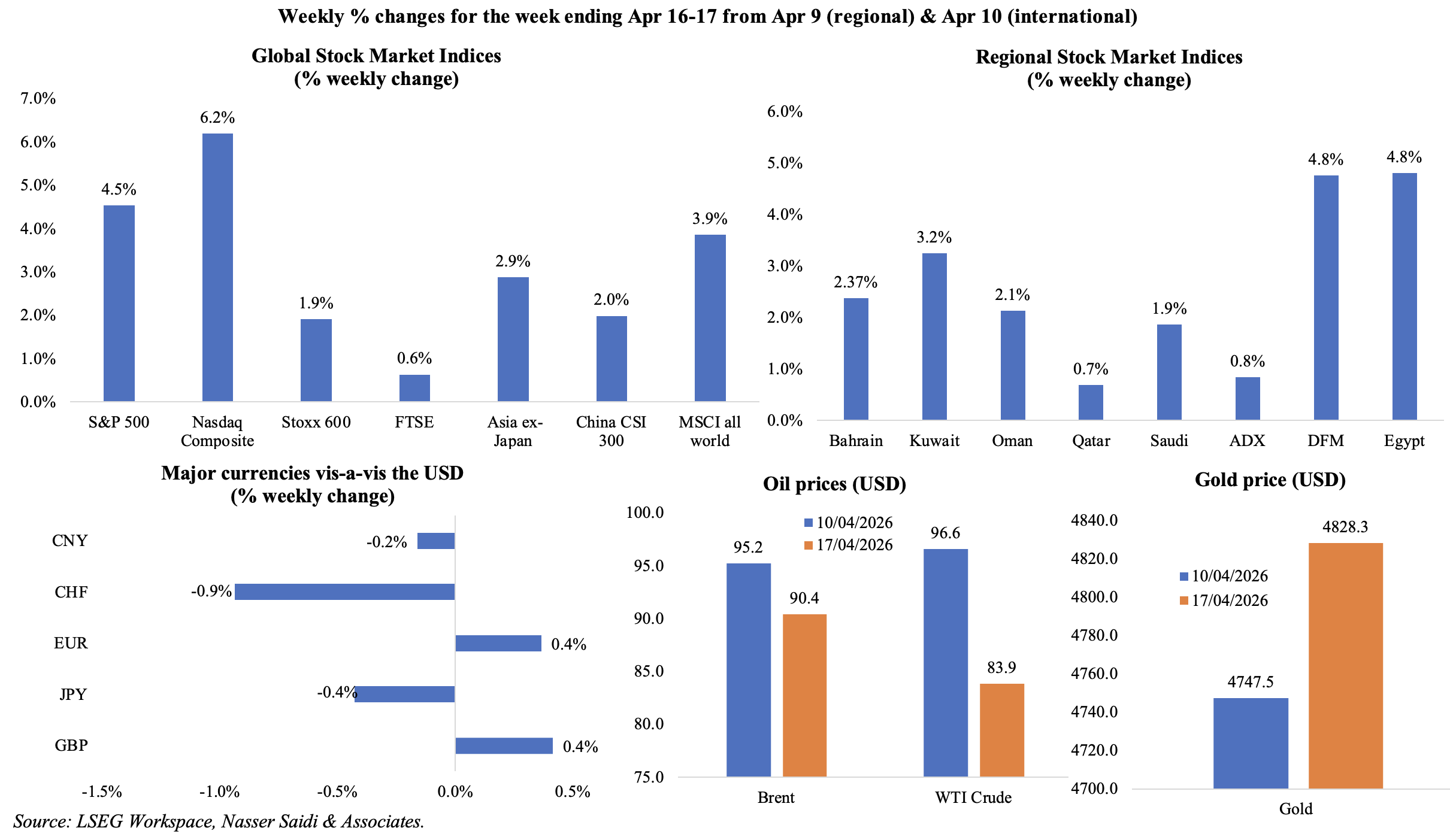 Global equity markets reflected optimism at the end of last week on Iran’s announcement about the Strait of Hormuz being open while the ceasefire was in place and news about a deal to end the war “soon”. US markets S&P 500 and Nasdaq posted record closes and markets across Europe and Asia closed higher; even Japan’s Nikkei closed at a record (despite concerns of energy imports from the Middle East). In the Gulf, Dubai surged to a six-week high as traders priced in a potential de-escalation of the Iran conflict; its 4.8% gain was the most in nine months.